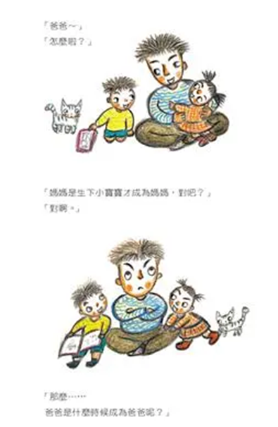 『爸爸,媽媽肚子裡有寶寶,所以媽媽知道要當媽媽了,那爸爸你肚子又沒寶寶,你怎麼知道你要當爸爸呢?』